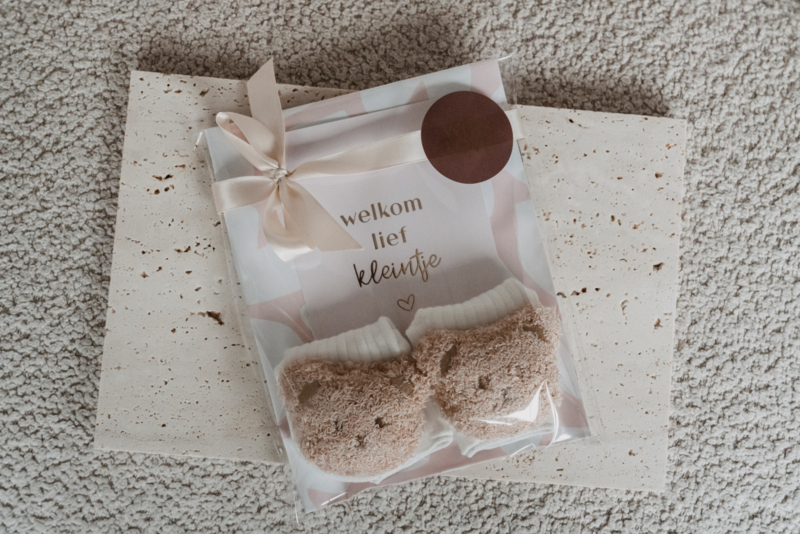 Het cadeautje is beschikbaar in een roze of bruine verpakking, zoals op de foto, en is perfect ingepakt om direct te geven. Ideaal om een pasgeboren kindje te verwelkomen en de kersverse ouders mee te verrassen.
