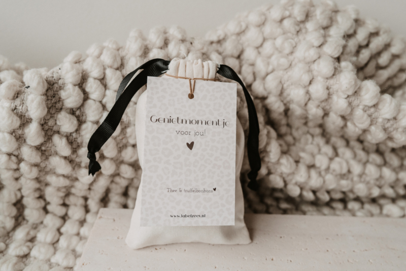 In dit zakje zit een lekker theetje en truffelbonbons – een echt verwenmomentje om even tot rust te komen en te genieten. Het kaartje met de tekst “Genietmomentje voor jou” maakt het cadeautje helemaal compleet.