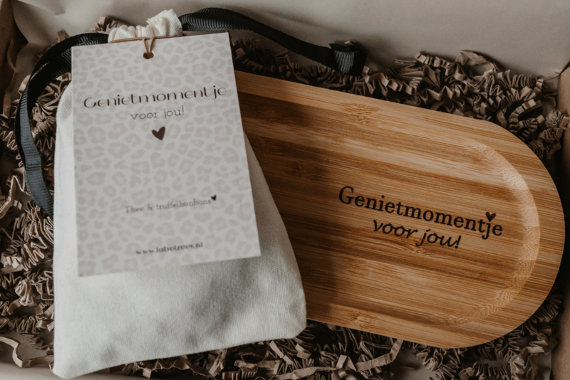 Brievenbus pakket "Genietmomentje voor jou" met serveerplankje bamboe of acacia